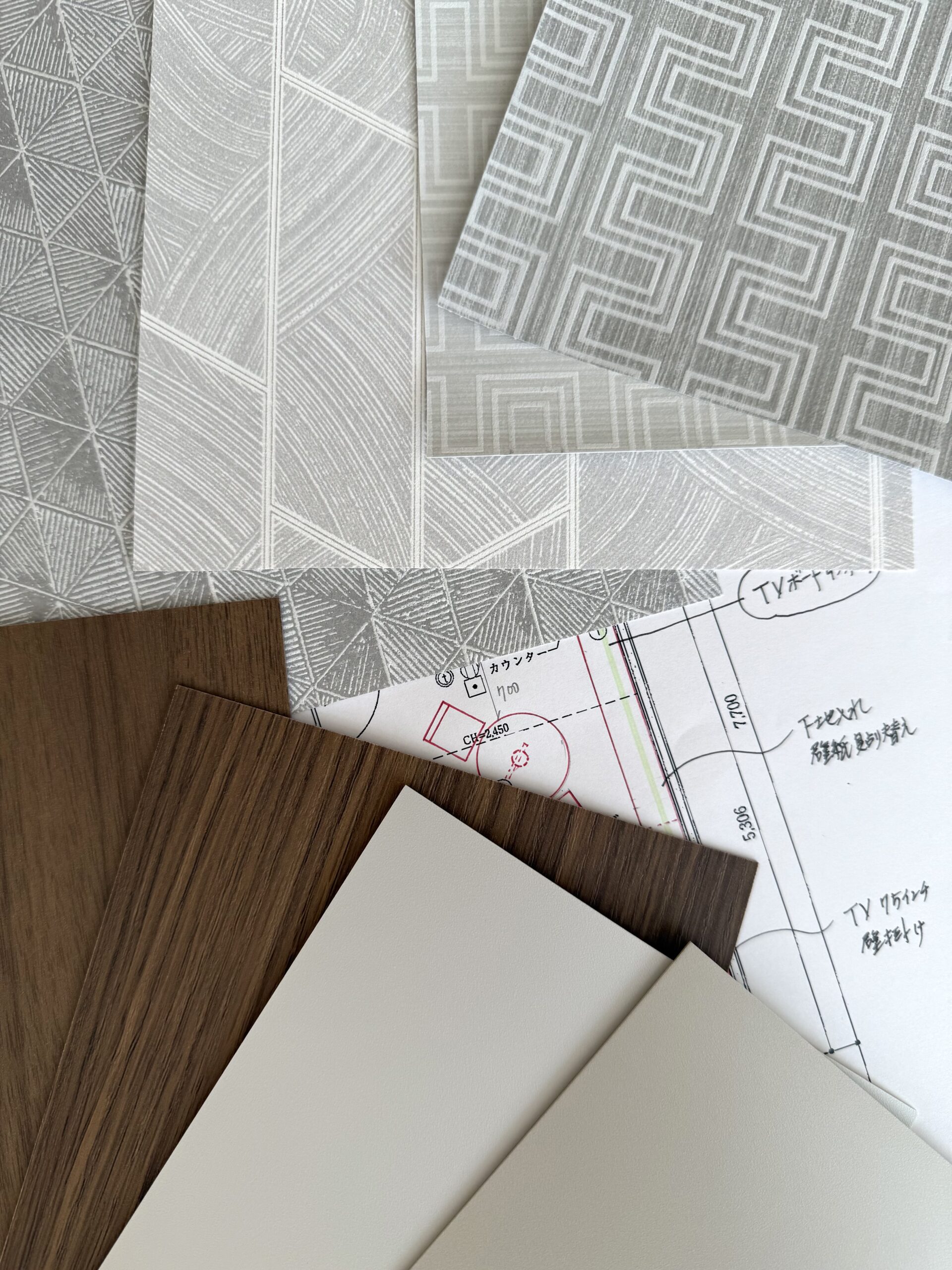床材やキッチン面材、お手持ち家具とのバランスを考えながらカラースキームを整えていきます。